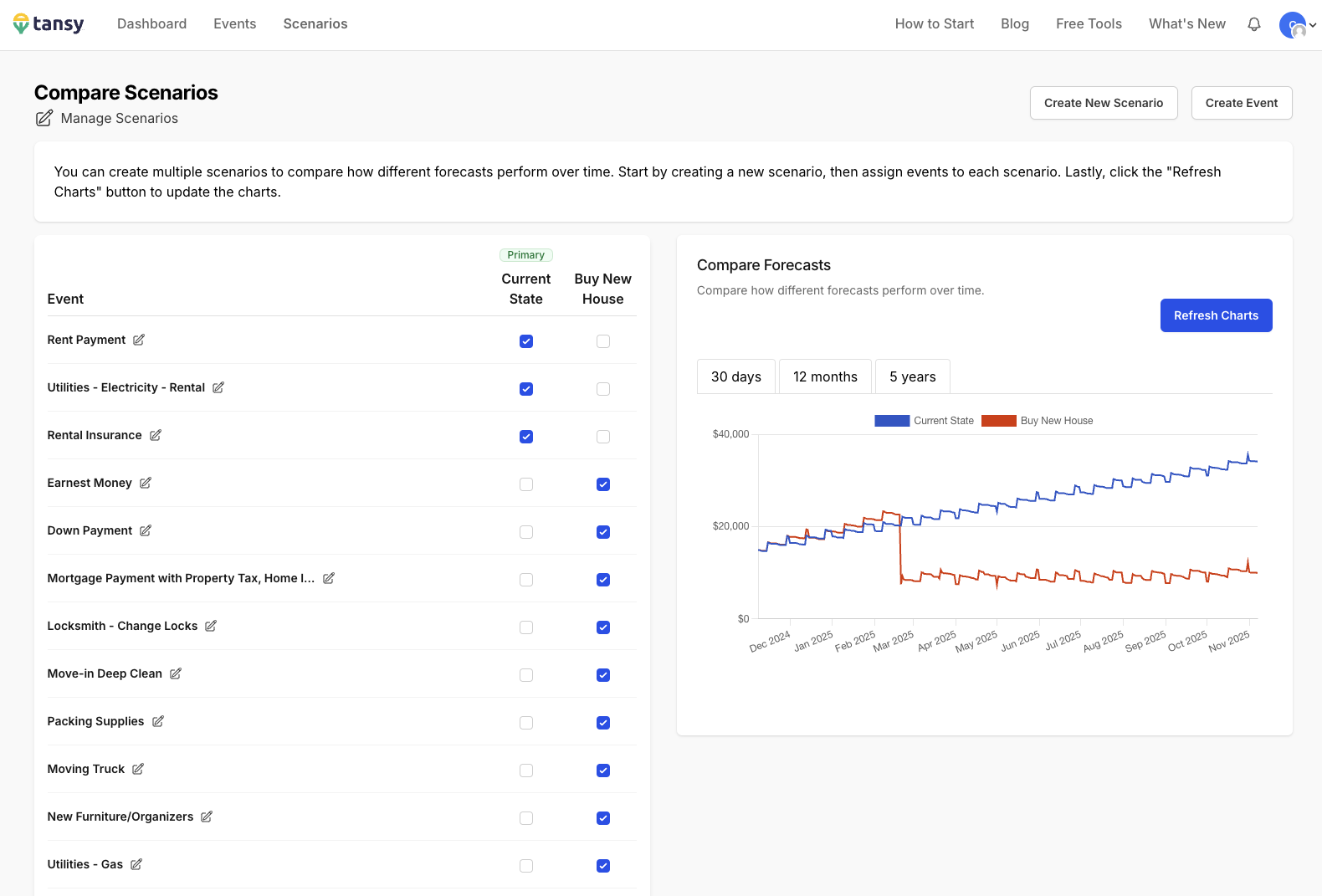 Tansy can help you assess the financial impact of selling your current home and buying a new one. You can create a scenario for buying a new house and compare it to your current scenario. This will help you understand how your cash flow will change if you decide to sell your current home and buy a new one.